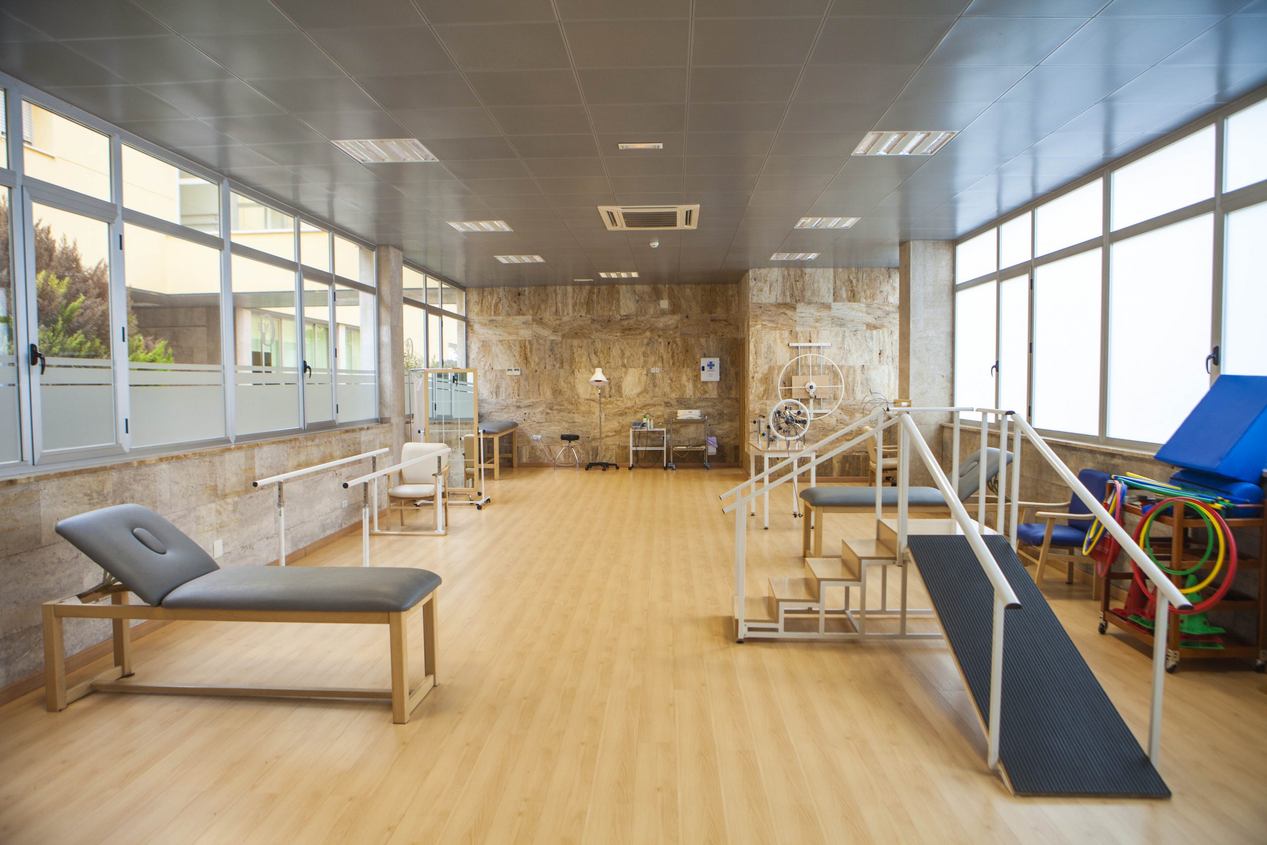 Fisioterapia. Con programas de rehabilitación, ejercicios adaptados y gerontogimnasia, realizados en nuestro gimnasio equipado y de gran tamaño.